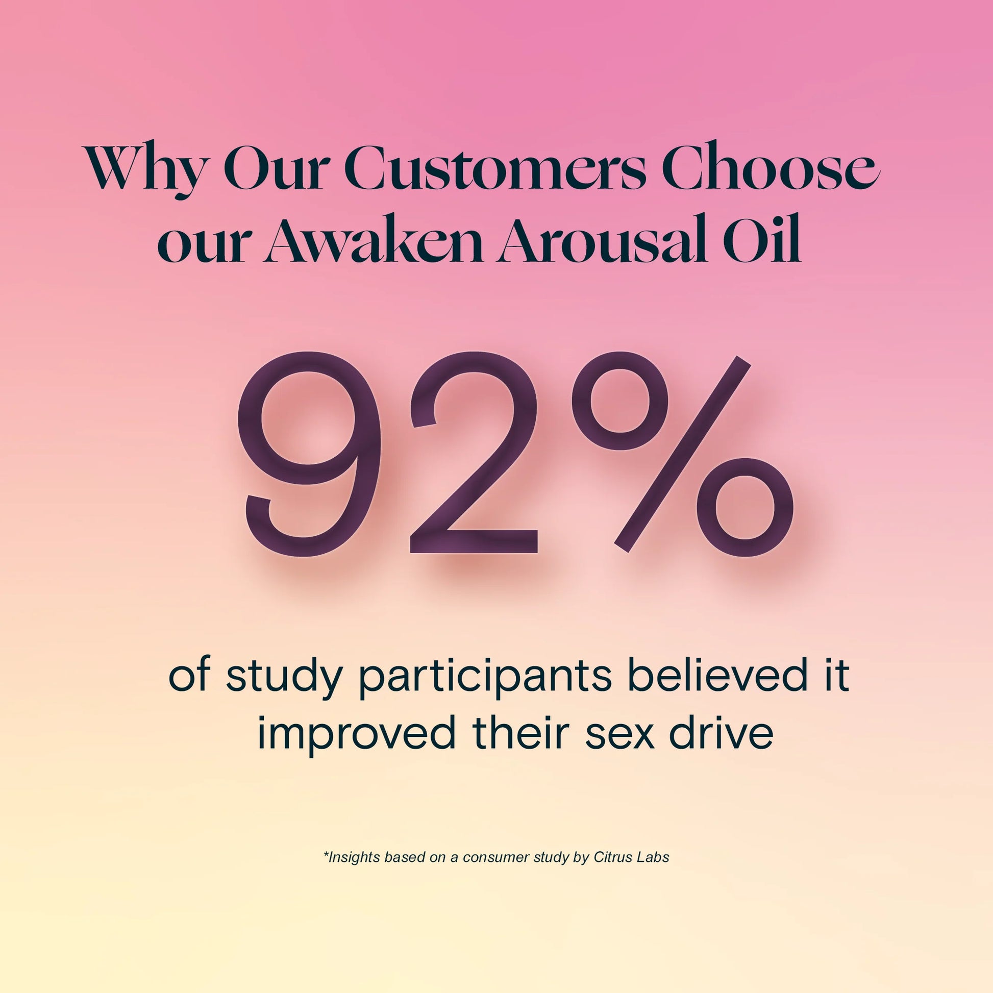 - 92% believed Awaken Arousal Oil improved their sex drive*