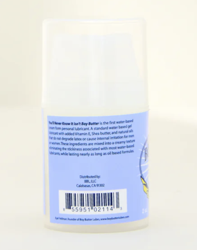 Boy Butter H2O Mini 2 ounces Pump Bottle Water Based Personal Lubricant. We are proud to introduces the worlds first water-based cream lubricant. Non-sticky, Mess free and smells amazing. First cream form lubricant to be totally latex safe. It is even gentle enough for vaginal use. Instead of oils we use Vitamin E, Shea Butter and Aloe Vera Extract to back up the water based cream. Features: Latex condom compatible. Washes off with water. Great for masturbation, anal and vaginal sex. Safe, Hypo-allergenic, gentle, female friendly, edible, and non-staining. Safe for use on most sex toys from rubber to glass and silicone. Safe on latex clothing. 4 year shelf life. Boy Butter H2O Based Personal Lubricant is proudly made in the USA and comes in a travel friendly 2 fl.oz (60 mL) mini bottle with pump dispenser.